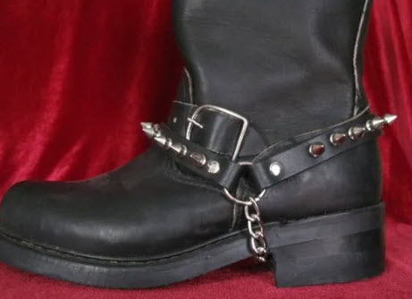 ONE ROW OF SPIKES AND BUCKLE FASTENER. ADJUST 1.5 INCHES AT 1/2 INCH INTERVALS. 5/8" WIDE. THE SIZE SHOWN ARE THE MEASUREMENT OF THE LEATHER STRAP THAT GOES AROUND THE BOOT, INCLUDING THE RINGS. MEASURE YOUR BOOT BEFORE ORDER IT.